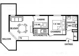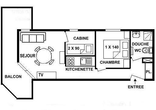 The apartment has a living room (the sofa is not a sleeping area), a fully-equipped kitchenette, a bedroom with a double bed (140cm), a cabin with bunk beds (2x90cm) (NB: the top bunk bed is not suitable for children under 6) and a shower room with non-separate WC.